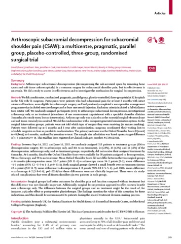 | Title: | Arthroscopic subacromial decompression for subacromial shoulder pain (CSAW): a multicentre, pragmatic, parallel group, placebo-controlled, three-group, randomised surgical trial |