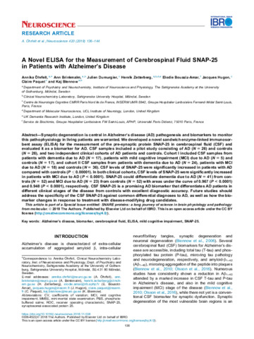Title: | A novel ELISA for the measurement of cerebrospinal fluid SNAP-25 in patients with Alzheimer's disease |