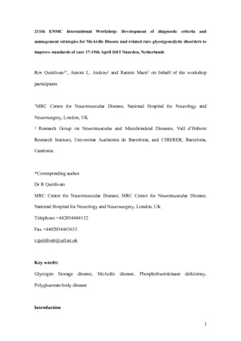 Title: | 211th ENMC International Workshop: Development of diagnostic criteria and management strategies for McArdle Disease and related rare glycogenolytic disorders to improve standards of care. 17-19 April 2015, Naarden, The Netherlands |