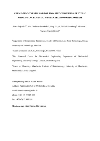 Title: | Chemo-biocatalytic one-pot two-step conversion of cyclic amine to lactam using whole cell monoamine oxidase |