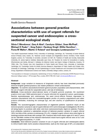 Title: | Associations between general practice characteristics with use of urgent referrals for suspected cancer and endoscopies: a cross-sectional ecological study |