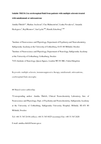 | Title: | Soluble TREM-2 in cerebrospinal fluid from patients with multiple sclerosis treated with natalizumab or mitoxantrone |