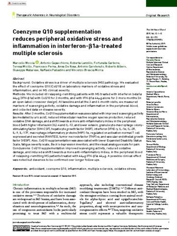 Title: | Coenzyme Q10 supplementation reduces peripheral oxidative stress and inflammation in interferon-β1a-treated multiple sclerosis |