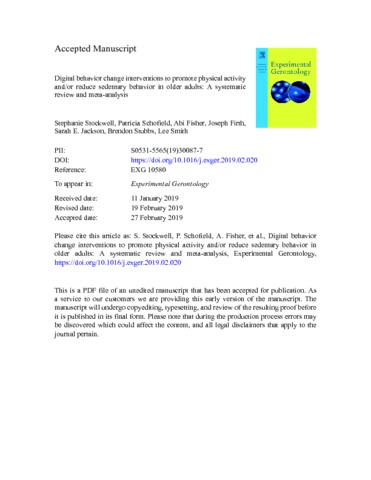 Stockwell et al. 2019 - Digital behavior change interventions to promote physical activity and or reduce sedentary behavior in older adults.pdf - Accepted Version Download (1MB) | Preview |