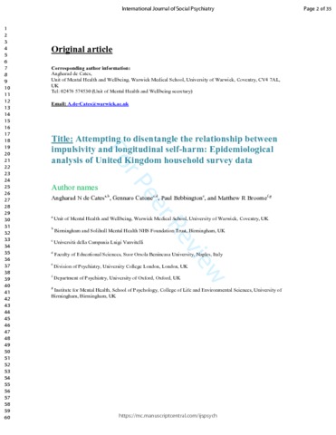 Title: | Attempting to disentangle the relationship between impulsivity and longitudinal self-harm: Epidemiological analysis of UK household survey data |
