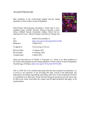 Beta synchrony in the cortico-basal ganglia network during regulation of force control on and off dopamine.