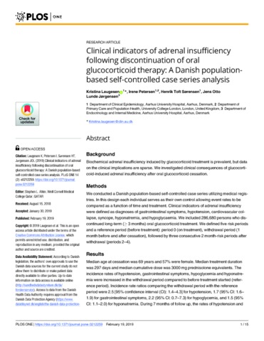 Title: | Clinical indicators of adrenal insufficiency following discontinuation of oral glucocorticoid therapy: A Danish population-based self-controlled case series analysis |