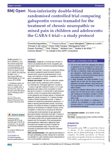 Title: | Non-inferiority double-blind randomised controlled trial comparing gabapentin versus tramadol for the treatment of chronic neuropathic or mixed pain in children and adolescents: the GABA-1 trial-a study protocol. |