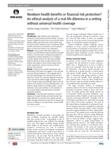 Title: | Newborn health benefits or financial risk protection? An ethical analysis of a real-life dilemma in a setting without universal health coverage |