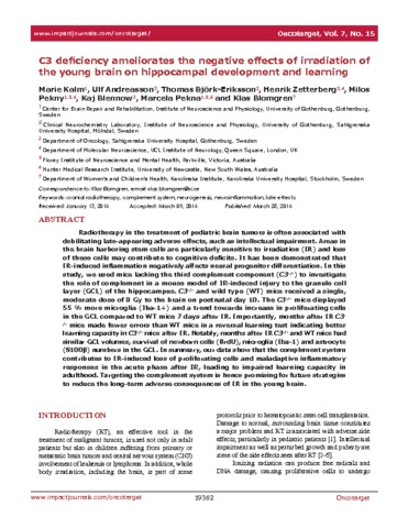 | Title: | C3 deficiency ameliorates the negative effects of irradiation of the young brain on hippocampal development and learning |