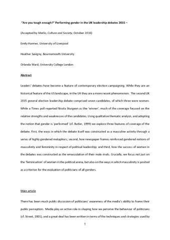 | Title: | ‘Are you tough enough?’ Performing gender in the UK leadership debates 2015 |