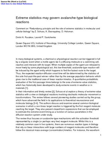 | Title: | Extreme statistics may govern avalanche-type biological reactions: Comment on “Redundancy principle and the role of extreme statistics in molecular and cellular biology” by Z. Schuss, K. Basnayake, D. Holcman |