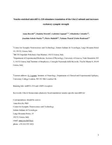 Lignani_Neurite-Enriched MicroRNA-218 Stimulates Translation of the GluA2 Subunit and Increases Excitatory Synaptic Strength_AAM.pdf - Accepted Version Download (9MB) | Preview |
