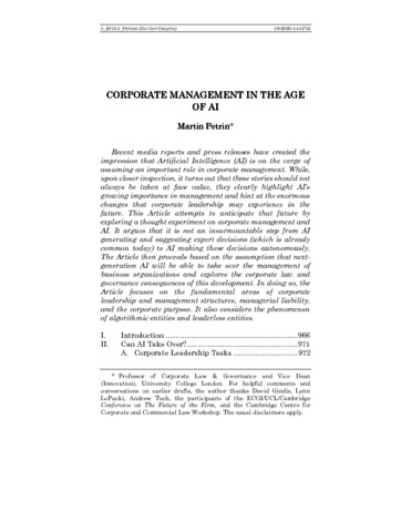 Recent media reports and press releases have created the impression that Artificial Intelligence (AI) is on the verge of assuming an important role in corporate management. While, upon closer inspection, it turns out that these stories should not always be taken at face value, they clearly highlight AI’s growing importance in management and hint at the enormous changes that corporate leadership may experience in the future. This Article attempts to anticipate that future by exploring a thought experiment on corporate management and AI. It argues that it is not an insurmountable step from AI generating and suggesting expert decisions (which is already common today) to AI making these decisions autonomously. The Article then proceeds based on the assumption that next-generation AI will be able to take over the management of business organizations and explores the corporate law and governance consequences of this development. In doing so, the Article focuses on the fundamental areas of corporate leadership and management structures, managerial liability, and the corporate purpose. It also considers the phenomenon of algorithmic entities and leaderless entities.
