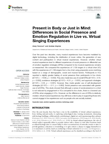 Title: | Present in Body or Just in Mind: Differences in Social Presence and Emotion Regulation in Live vs. Virtual Singing Experiences |