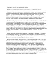 The crisis of our times is that we have science without wisdom. This is the crisis behind all the others. In order to solve this crisis, and make progress towards a better world we need to learn how to do it. That requires that our institutions of learning are rationally designed and devoted to the job. At present they are not. Having universities devoted almost exclusively to the pursuit of knowledge is a recipe for disaster. We need urgently to bring about a revolution in universities around the world so that their basic aim becomes to promote wisdom, and not just acquire knowledge