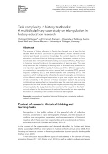 The purpose of history education in Austria has changed over at least the last decade. While the focus used to be to give students a master narrative of the national past based on positivist knowledge, the current objective of history education is to foster historical thinking processes that enable students to form transferable skills in the self-reflected handling and creation of history. A key factor in fostering historical thinking is the appropriation of learning tasks. This case study measures the complexity of learning tasks in Austrian history textbooks as one important aspect of their quality. It makes use of three different approaches to complexity to triangulate the notion: general task complexity (GTC), general linguistic complexity (GLC), and domain-specific task complexity (DTC). The question is which findings can be offered by the specific strengths and limitations of the different methodological approaches to give new insights into the study of task complexity in the domain of history education research. By pursuing multidisciplinary approaches in a triangulating way, the case study opens up new prospects for this field. Besides offering new insights on measuring the complexity of learning tasks, the study illustrates the need for further research in this field – not only related to the development of analytical frameworks, but also regarding the notion of complexity in the context of historical learning itself.