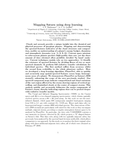Clouds and aerosols provide unique insight into the chemical and physical processes of gas-giant planets. Mapping and characterizing the spectral features indicative of the cloud structure and composition enables an understanding of a planet’s energy budget, chemistry and atmospheric dynamics. Current space missions to Solar System planets produce high-quality datasets, yet the sheer amount of data obtained often prohibits detailed ‘by hand’ analyses. Current techniques rely mainly on two approaches: identifying the existence of spectral features by dividing the fluxes of two or more spectral channels, and performing full radiative transfer calculations for individual spectra. The first method is not sufficiently accurate and the second is not easily scalable to the entire planetary surface. Here we have developed a deep learning algorithm, PlanetNet, that is able to quickly and accurately map spatial and spectral features across large, heterogeneous areas of a planet. We use PlanetNet to delineate the major components of the 2008 storm on Saturn, enhancing the scope of the area previously studied and indicating regions that can be probed more deeply with radiative transfer models. Our spectral-component maps indicate compositional and cloud variations of the vast region affected by the storm, showing regions of vertical upwelling, and diminished clouds at the centre of compact substorms.