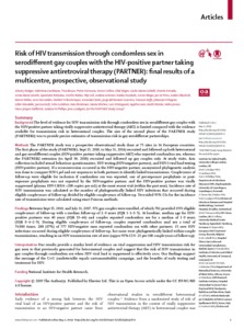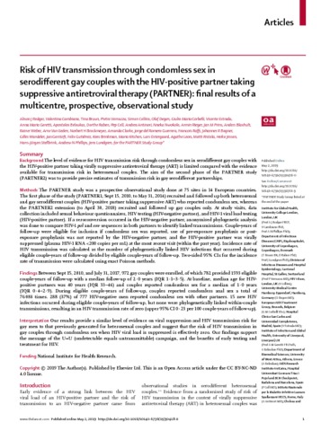 Title: | Risk of HIV transmission through condomless sex in serodifferent gay couples with the HIV-positive partner taking suppressive antiretroviral therapy (PARTNER): final results of a multicentre, prospective, observational study |