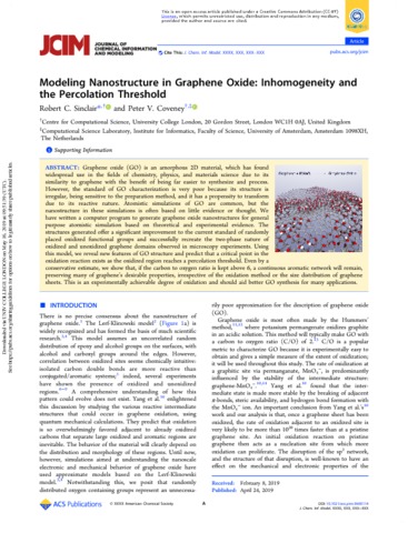 : Graphene oxide (GO) is an amorphous 2D material, which has found widespread use in the fields of chemistry, physics, and materials science due to its similarity to graphene with the benefit of being far easier to synthesize and process. However, the standard of GO characterization is very poor because its structure is irregular, being sensitive to the preparation method, and it has a propensity to transform due to its reactive nature. Atomistic simulations of GO are common, but the nanostructure in these simulations is often based on little evidence or thought. We have written a computer program to generate graphene oxide nanostructures for general purpose atomistic simulation based on theoretical and experimental evidence. The structures generated offer a significant improvement to the current standard of randomly placed oxidized functional groups and successfully recreate the two-phase nature of oxidized and unoxidized graphene domains observed in microscopy experiments. Using this model, we reveal new features of GO structure and predict that a critical point in the oxidation reaction exists as the oxidized region reaches a percolation threshold. Even by a conservative estimate, we show that, if the carbon to oxygen ratio is kept above 6, a continuous aromatic network will remain, preserving many of graphene’s desirable properties, irrespective of the oxidation method or the size distribution of graphene sheets. This is an experimentally achievable degree of oxidation and should aid better GO synthesis for many applications.