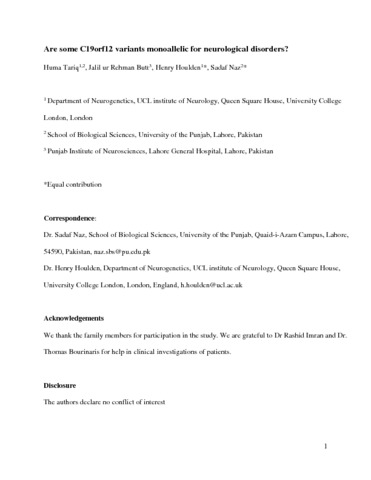Are some C19orf12 variants monoallelic for neurological disorders?