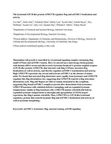 Title: | The lysosomal GPCR-like protein GPR137B regulates Rag and mTORC1 localization and activity |