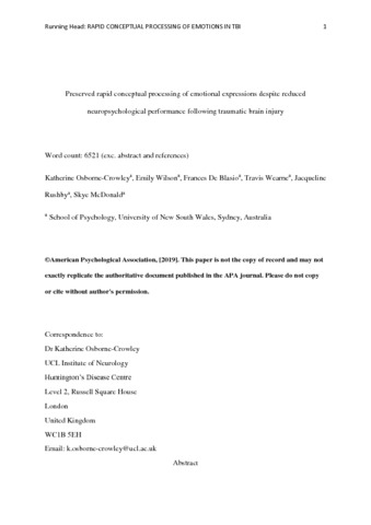 Title: | Preserved rapid conceptual processing of emotional expressions despite reduced neuropsychological performance following traumatic brain injury |