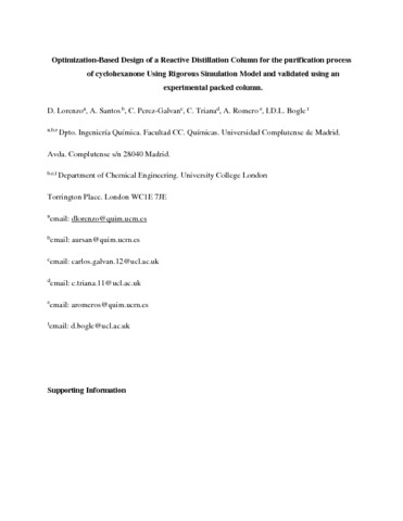 Optimization-Based Design of a Reactive Distillation Column for the Purification Process of Cyclohexanone Using Rigorous Simulation Model and Validated Using an Experimental Packed Column.