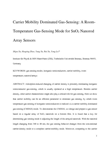 | Title: | Carrier Mobility-Dominated Gas Sensing: A Room-Temperature Gas-Sensing Mode for SnO₂ Nanorod Array Sensors |