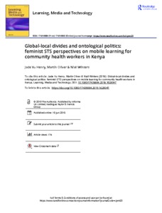 | Title: | Global-local divides and ontological politics: feminist STS perspectives on mobile learning for community health workers in Kenya |
