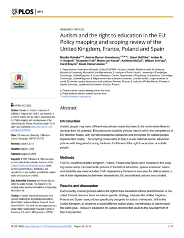 | Title: | Autism and the right to education in the EU: Policy mapping and scoping review of the United Kingdom, France, Poland and Spain |