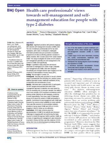 Objectives Significant problems with patients engaging with diabetes self-management education (DSME) exist. The role of healthcare professionals (HCPs) has been highlighted, with a lack of enthusiasm, inadequate information provision and poor promotion of available programmes all cited as affecting patients’ decisions to attend. However, little is known about HCPs’ views towards DSME. This study investigates the views of HCPs towards self-management generally and self-management in the context of DSME more specifically. Design A qualitative study using semi-structured interviews to investigate HCPs views of type 2 diabetes self-management and DSME. Data were analysed thematically and emergent themes were mapped on to the constructs of Normalisation Process Theory (NPT). Setting Two boroughs in London, UK. Participants Sampling was purposive to recruit a diverse range of professional roles including GPs, practice nurses, diabetes specialist nurses, healthcare assistants (HCAs), receptionists and commissioners of care. Results Interviews were conducted with 22 participants. The NPT analysis demonstrated that while a selfmanagement approach to diabetes care was viewed by HCPs as necessary and, in principle, valuable, the reality is much more complex. HCPs expressed ambivalence about pushing certain patients into self-managing, preferring to retain responsibility. There was a lack of awareness among HCPs about the content of DSME and benefits to patients. Commitment to and engagement with DSME was tempered by concerns about suitability for some patients. There was little evidence of communication between providers of group-based DSME and HCPs or of HCPs engaging in work to follow-up non-attenders. Conclusions HCPs have concerns about the appropriateness of DSME for all patients and discussed challenges to engaging with and performing the tasks required to embed the approach within practice. DSME, as a means of supporting self-management, was considered important in theory, but there was little evidence of HCPs seeing their role as extending beyond providing referrals.