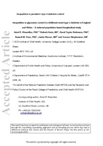 Title: | Inequalities in glycaemic control in childhood onset type 2 diabetes in England and Wales - A national population-based longitudinal study |