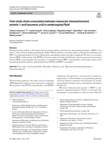 Title: | Twin study shows association between monocyte chemoattractant protein-1 and kynurenic acid in cerebrospinal fluid |