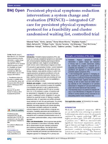 Title: | Persistent physical symptoms reduction intervention: A system change and evaluation (PRINCE) - Integrated GP care for persistent physical symptoms: Protocol for a feasibility and cluster randomised waiting list, controlled trial |