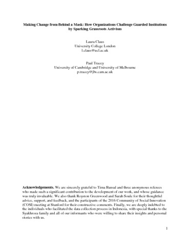 Claus_Making Change from Behind a Mask. How Organizations Challenge Guarded Institutions by Sparking Grassroots Activism_AAM.pdf - Accepted Version Download (2MB) | Preview |