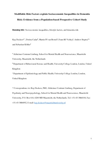 | Title: | Modifiable Risk Factors Explain Socioeconomic Inequalities in Dementia Risk: Evidence from a Population-Based Prospective Cohort Study |