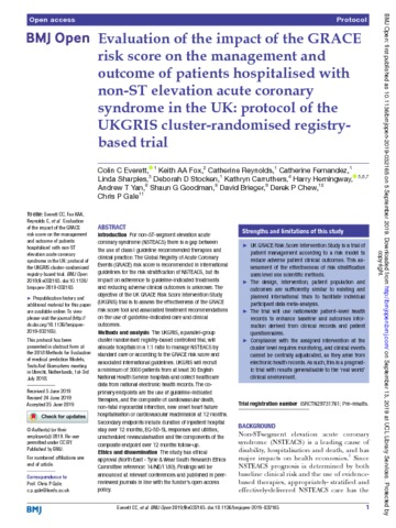 Title: | Evaluation of the impact of the GRACE risk score on the management and outcome of patients hospitalised with non-ST elevation acute coronary syndrome in the UK: protocol of the UKGRIS cluster-randomised registry-based trial |