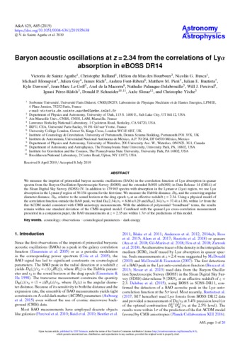 Title: | Baryon acoustic oscillations at z=2.34 from the correlations of Ly alpha absorption in eBOSS DR14 |