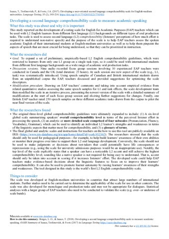 Title: | Developing a second language comprehensibility scale to measure academic speaking. OASIS Summary of Isaacs, T., Trofimovich, P. & Foote, J. A. (2018), in: Language Testing |
