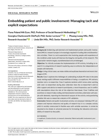 Title: | Embedding patient and public involvement: Managing tacit and explicit expectations |