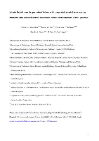 | Title: | Mental health care for parents of babies with congenital heart disease during intensive care unit admission: Systematic review and statement of best practice |