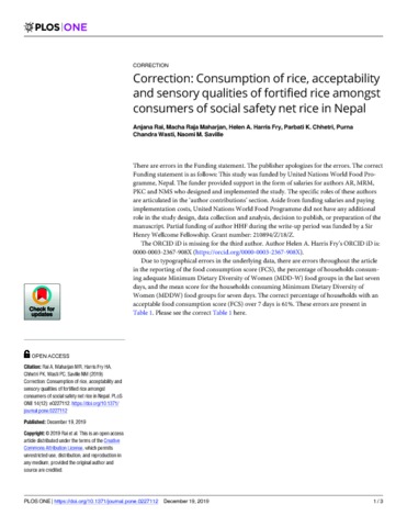 Saville_Consumption of rice, acceptability and sensory qualities of fortified rice amongst consumers of social safety net rice in Nepal_VoR.pdf - Published Version Download (1MB) | Preview |