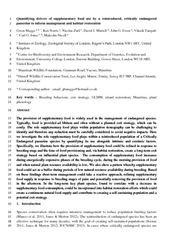 Title: | Quantifying drivers of supplementary food use by a reintroduced, critically endangered passerine to inform management and habitat restoration |