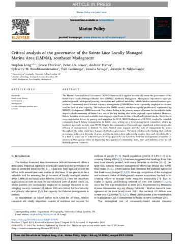 Title: | Critical analysis of the governance of the Sainte Luce Locally Managed Marine Area (LMMA), southeast Madagascar |
