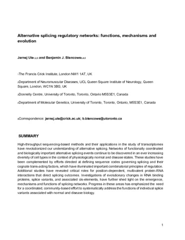 | Title: | Alternative Splicing Regulatory Networks: Functions, Mechanisms, and Evolution |