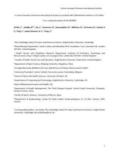 Title: | Is Active Transport and Leisure-Time Physical Activity Associated With Inflammatory Markers in US Adults? A Cross-Sectional Analyses From NHANES |