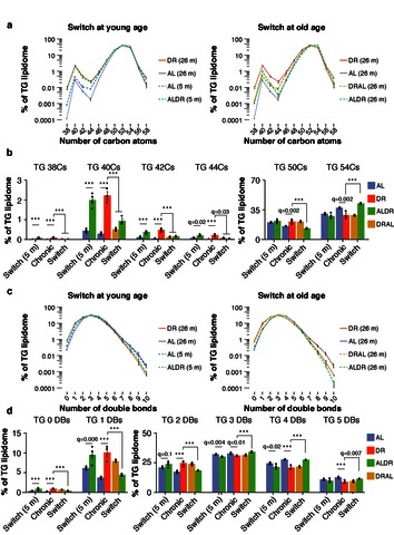 Dietary restriction (DR) during adulthood can greatly extend lifespan and improve metabolic health in diverse species. However, whether DR in mammals is still effective when applied for the first time at old age remains elusive. Here, we report results of a late-life DR-switch experiment using 800 mice. Female mice aged 24 months were switched from an ad libitum (AL) diet to DR or vice versa. Strikingly, the switch from DR to AL acutely increases mortality, whereas the switch from AL to DR causes only a weak and gradual increase in survival, suggesting the body has a memory of earlier nutrition. RNA sequencing in liver and brown and white adipose tissue (BAT and WAT, respectively) demonstrates a largely refractory transcriptional and metabolic response in fat tissue to DR after an AL diet, particularly in WAT, and a proinflammatory signature in aged preadipocytes, which is prevented by chronic DR feeding. Our results provide evidence for a ‘nutritional memory’ as a limiting factor for DR-induced longevity and metabolic remodelling of WAT in mammals.