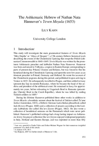 Title: | The Ashkenazic Hebrew of Nathan Nata Hannover’s Yeven Meṣula (1653) |