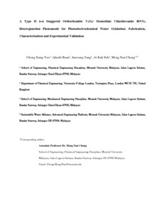 Title: | A Type II n-n staggered orthorhombic V2O5/monoclinic clinobisvanite BiVO4 heterojunction photoanode for photoelectrochemical water oxidation: Fabrication, characterisation and experimental validation |